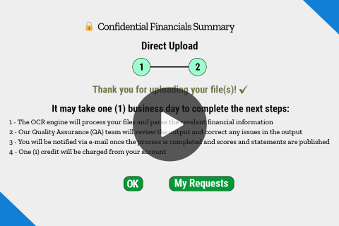 From user or their designated supplier invitee upload of financial statements to actionable insights in 1 business day.