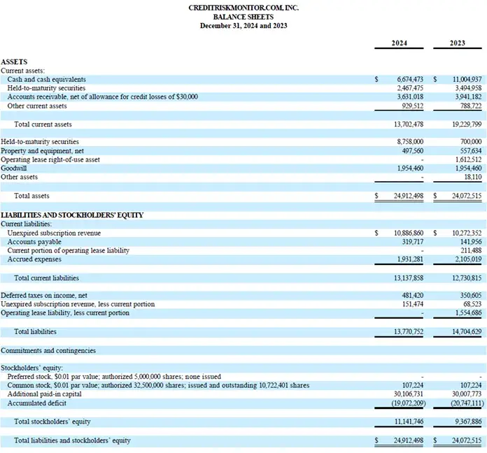 VALLEY COTTAGE, NY — March 20, 2025 — CreditRiskMonitor.com, Inc. (OTCQX: CRMZ) reported revenues of $19.8 million, an increase of approximately $878 thousand or 5%, for the year ended December 31, 2024, as compared to 2023. The Company reported operating income of approximately $1.25 million, a decrease of approximately $243 thousand for 2024 as compared to 2023. The decrease in operating income was primarily due to increased data and product costs associated with higher employee expenses and third-party content costs. The Company reported net income of approximately $1.67 million, a decrease of approximately $20 thousand for 2024 as compared to 2023.