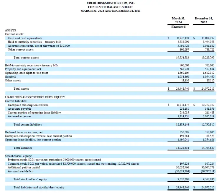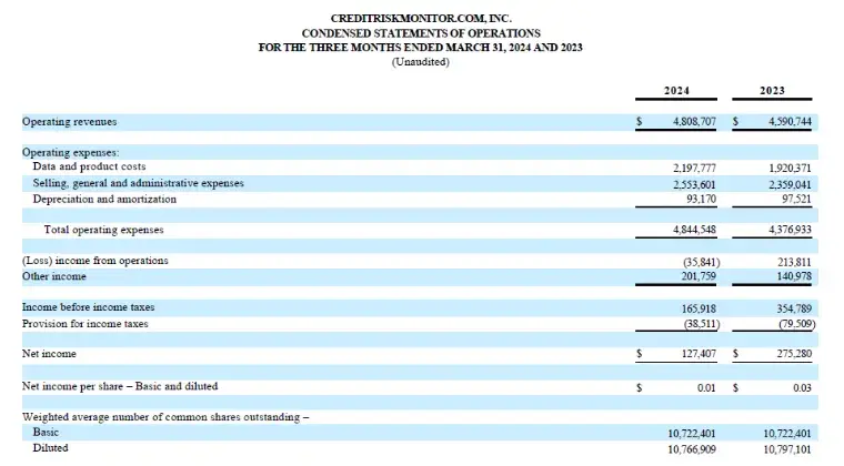 VALLEY COTTAGE, N.Y. - May 14, 2024 - CreditRiskMonitor (OTCQX:CRMZ) reported operating revenues of $4.8 million, an increase of approximately $218 thousand or 5%, for the first quarter of fiscal 2024 compared to the same period of fiscal 2023. The Company reported pre-tax income of approximately $166 thousand, a decrease of approximately $189 thousand, for the first quarter of fiscal 2024 compared to the same period of fiscal 2023. The decrease in pre-tax profitability was primarily driven by increased expenses related to employee salaries, employee benefits, commissions, and third-party content due to inflation.